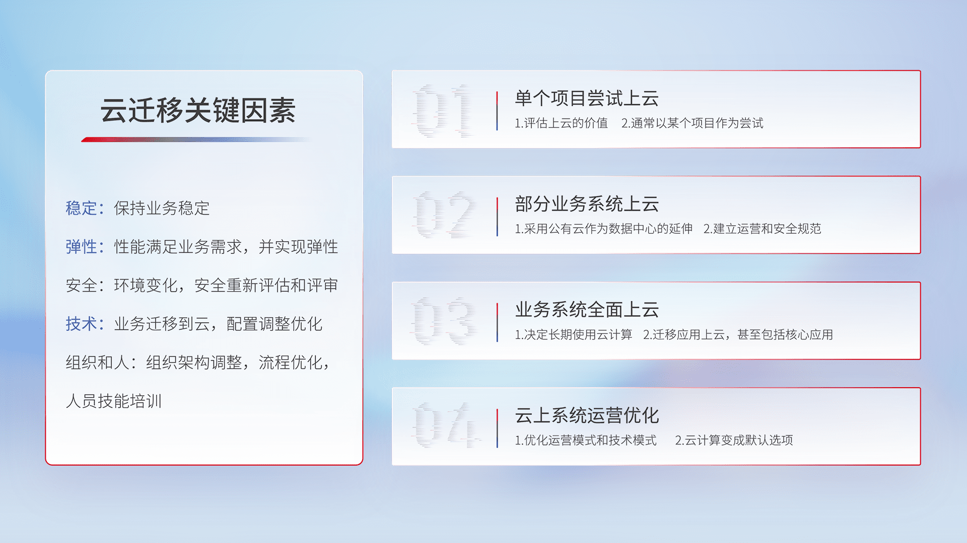 结合实际业务,,,从规划设计、、、、云平台选型、、、云原生改造、、数据迁移、、、集成交付,,,迁移全过程为客户识别最佳上云路径,,,,做好风险识别管理,,设计网络架构、、身份权限、、、、安全审计合规、、操作审计、、、日志审计、、、监控告警策略、、、、多站点容灾设计等,,,,对云上基础设施进行整体规划,,,,提升IT治理水平,,以满足弹性、、高可用、、、、高性能的需求。。