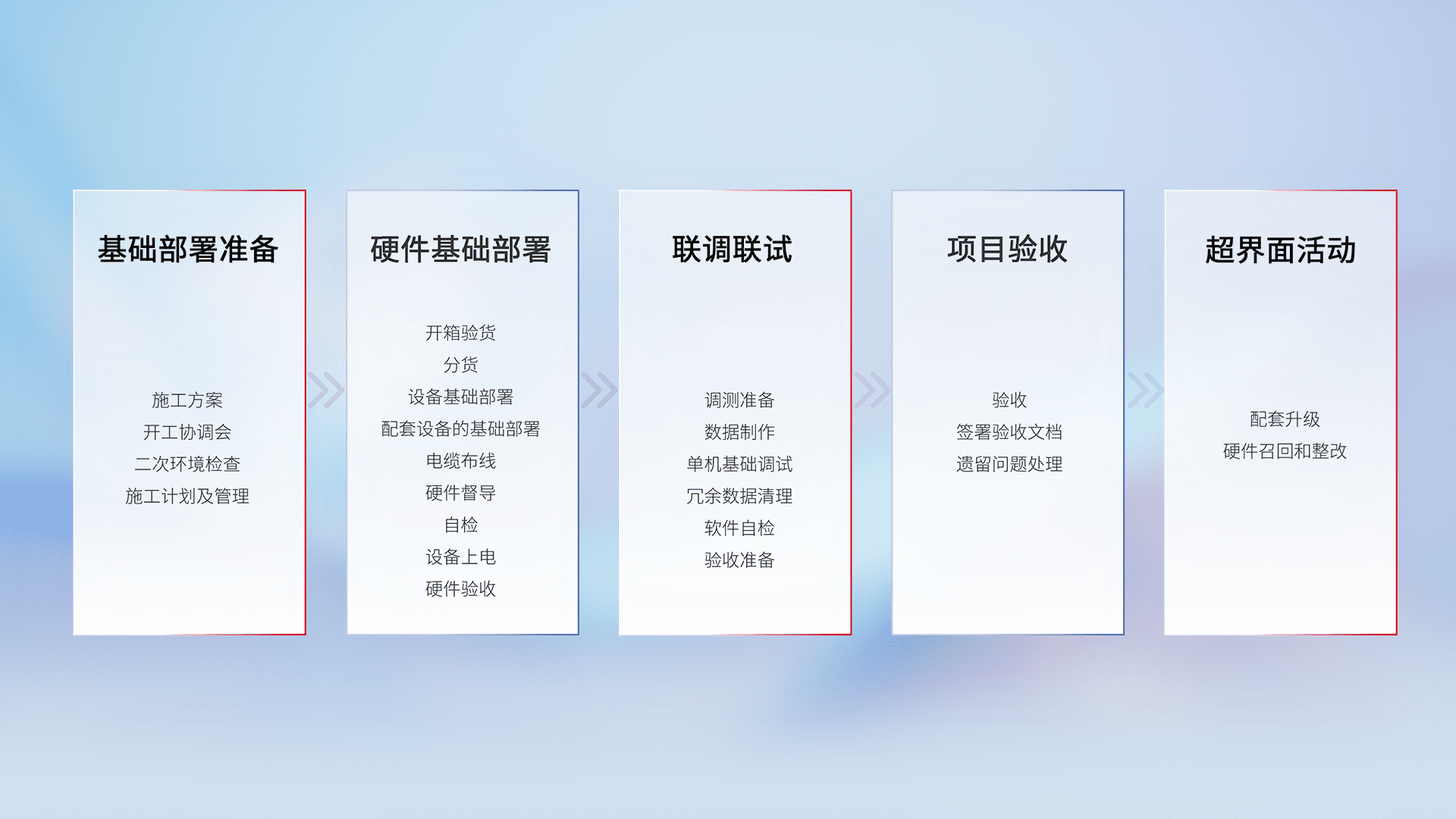 从基础部署准备、、硬件基础部署、、、联调联试、、、项目验收、、越界面活动的全过程可追溯,,,保证施工质量和进度。。